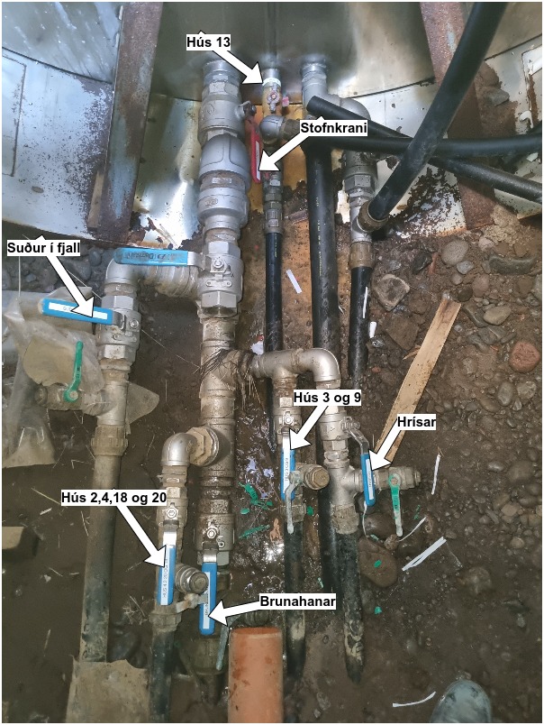 Hér eru merkingar sem segja til um hvaða krani er fyrir hvaða hús.